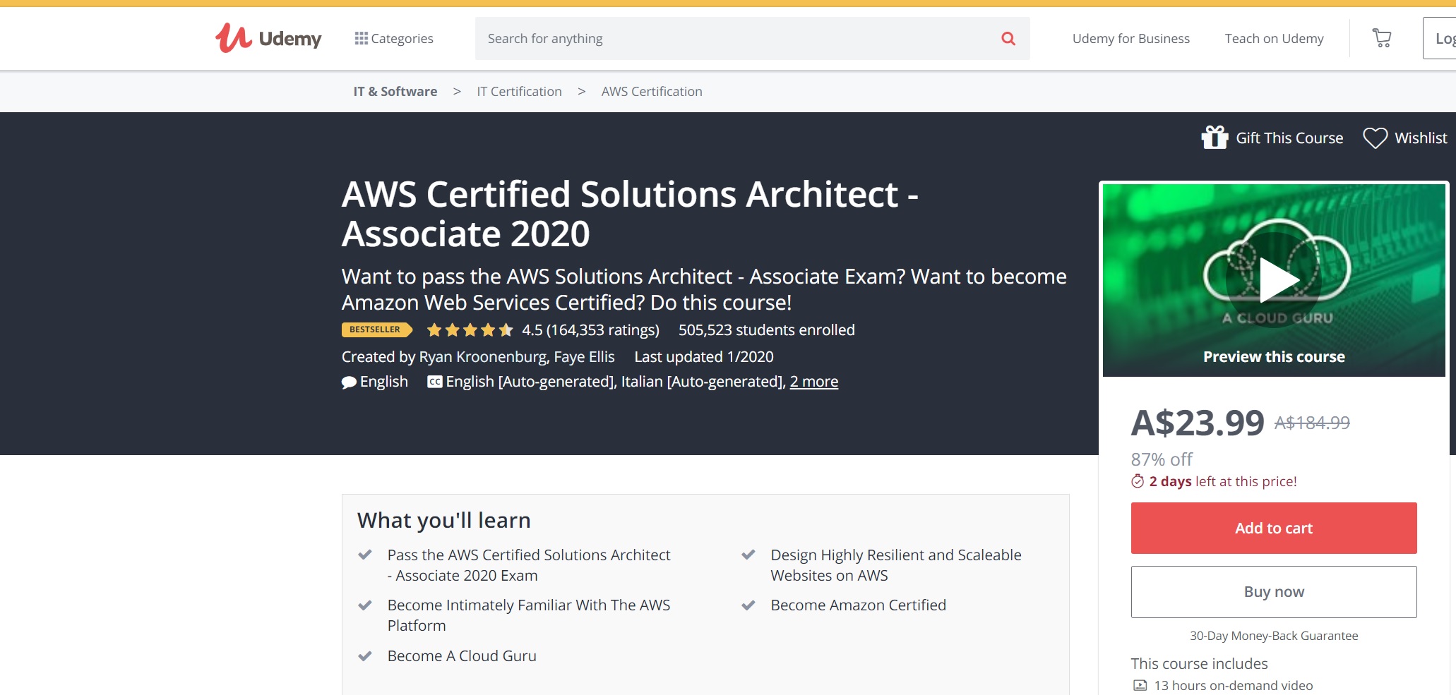 This is the best AWS Solutions Architect – Associate training course I have come across. This will teach you how AWS hybrid cloud infrastructure can be designed and applications deployed.