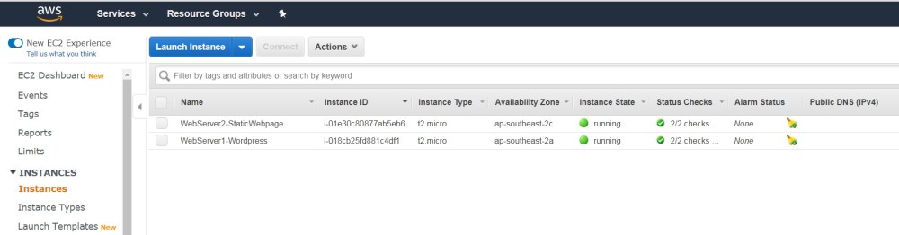 The two web servers crated: one for WordPress web server and one hosting a static website.
