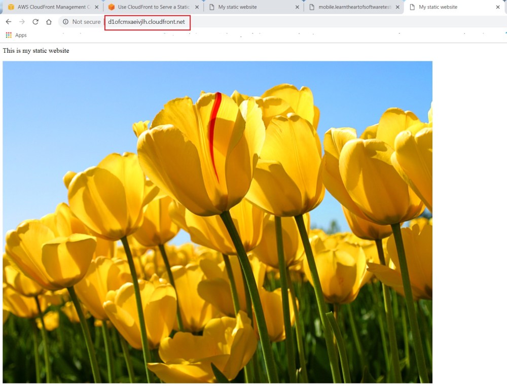 Once the record set is created, it could take 24 – 32 hours before the changes propagate to all the name servers. In our case, if we type the url: https://mobile.learntheartofsoftwaretesting.com, we will now see our static website from the s3 bucket, distributed over CloudFront and accessible only over https.
