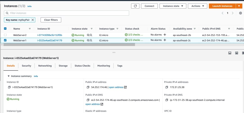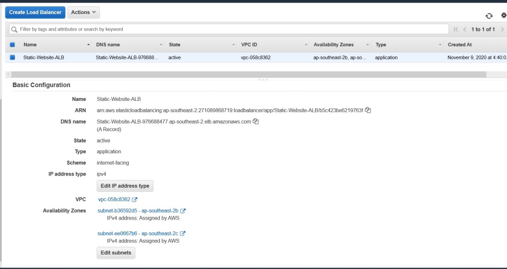 In my example, I have two EC2 instances (one in ap-southeast-2B and the other in ap-southeast-2c, Sydney region), that are accessed over an application Load Balancer (static-website-alb-976688477.ap-southeast-2.elb.amazonaws.com). Having two EC2 instances across two different availability zone means that the static website will have high availability and in the event that one of the EC2 instance crashes, the static website will still be served.