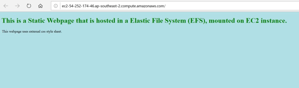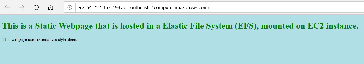 WebServer1 (with public IP address of 54.252.174.46) is now mounted with EFS and hence shows below site which is hosted on EFS.