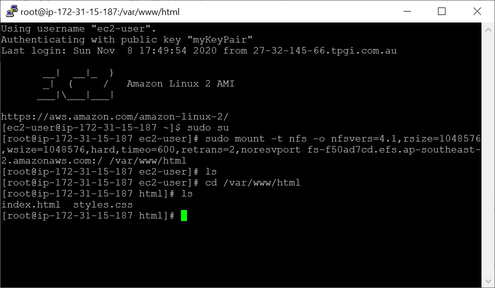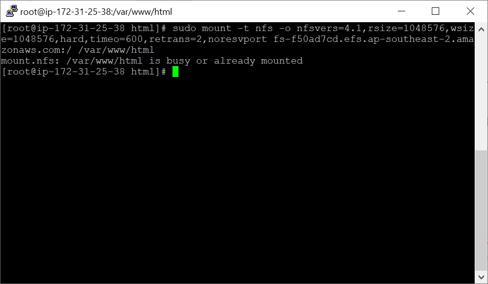 sudo mount -t nfs -o nfsvers=4.1,rsize=1048576,wsize=1048576,hard,timeo=600,retrans=2,noresvport fs-f50ad7cd.efs.ap-southeast-2.amazonaws.com:/ /var/www/html