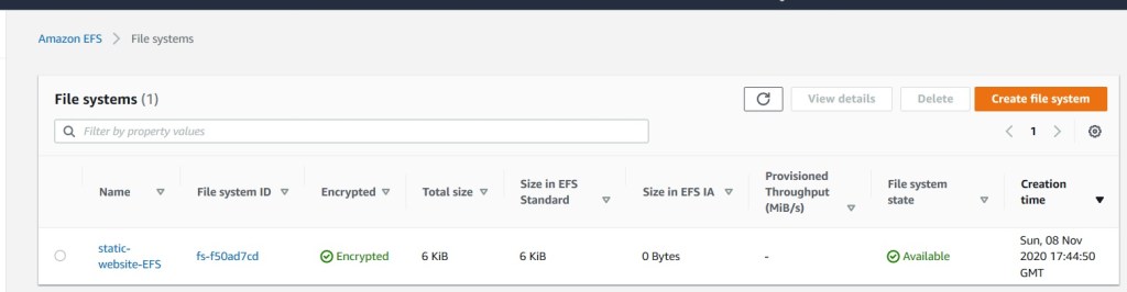 Here, fs-f50ad7cd.efs.ap-southeast-2.amazonaws.com is the EFS DNS name. In the new EFS layout in AWS console, the DNS name is not defined and hence needs to be derived from the file system ID. So if the file system ID for EFS is “fs-f50ad7cd” then the DNS name will be “fs-f50ad7cd.efs.ap-southeast-2.amazonaws.com (FileSystemID.efs.Region.amazonaws.com).